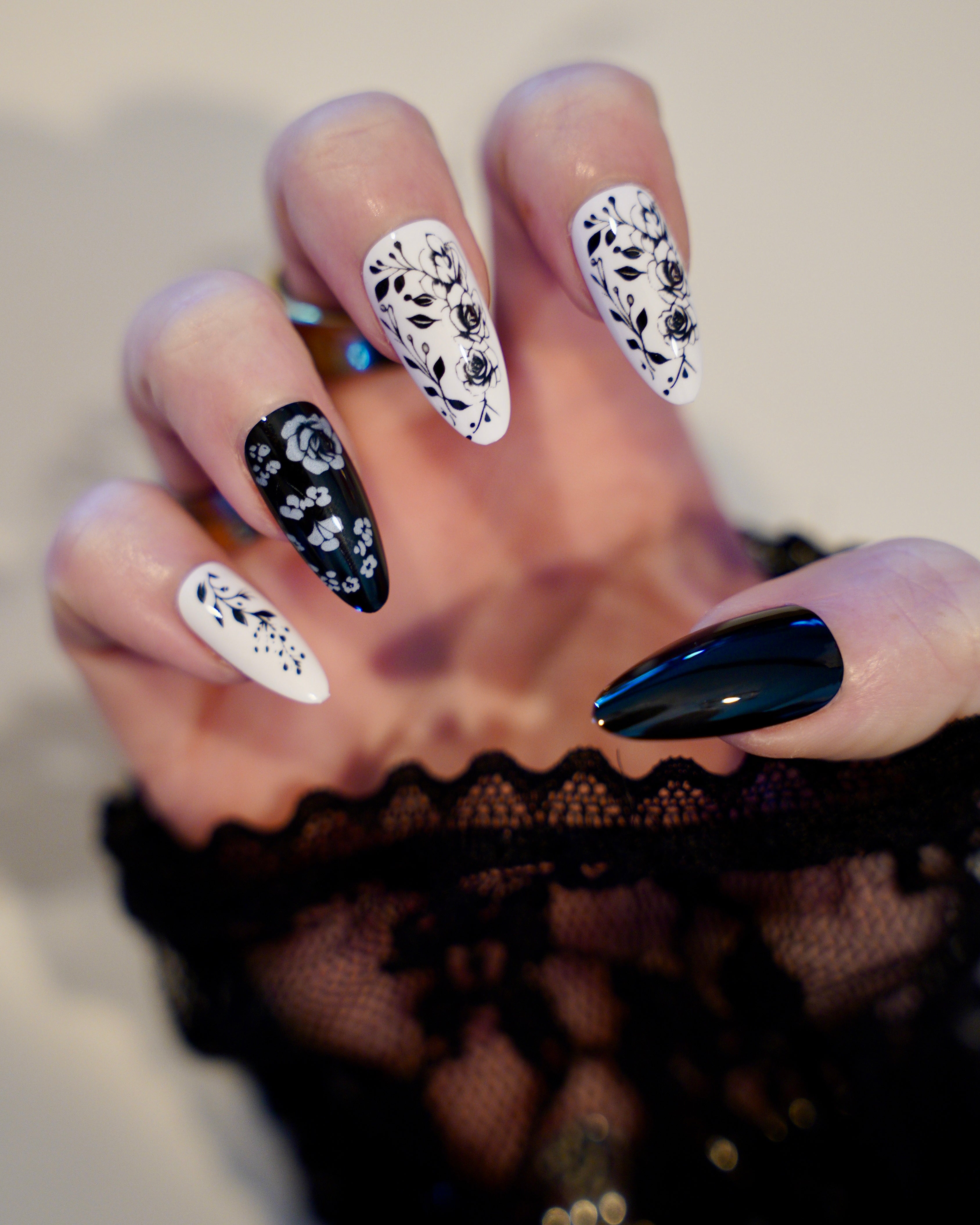 πΉ Step into timeless elegance with the Black Tie Bouquet Press-On Manicure Set. Featuring a sophisticated medium almond shape, this set pairs sleek black and crisp white nails with delicate floral accents for a look thatβs both bold and feminine.