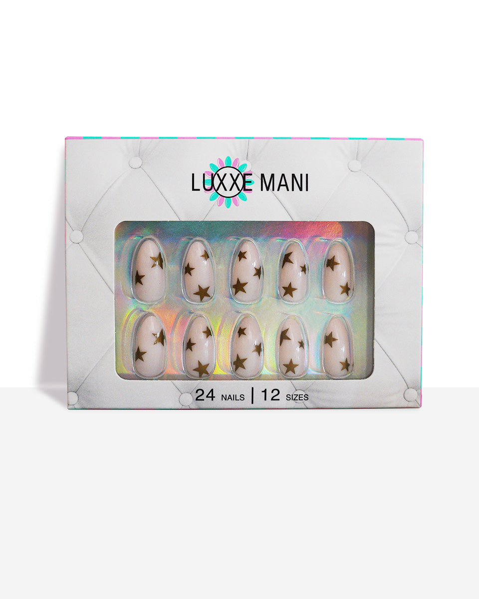 Introducing Cosmic Kiss, a dreamy medium almond-shaped nail set that blends elegance with a touch of celestial magic. These gorgeous press-ons feature a pale, semi-sheer nude pink base adorned with delicate gold stars, offering a perfect balance of subtlety and sparkle.