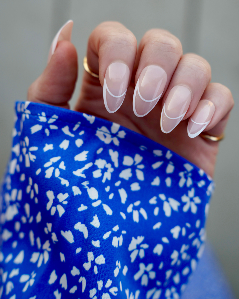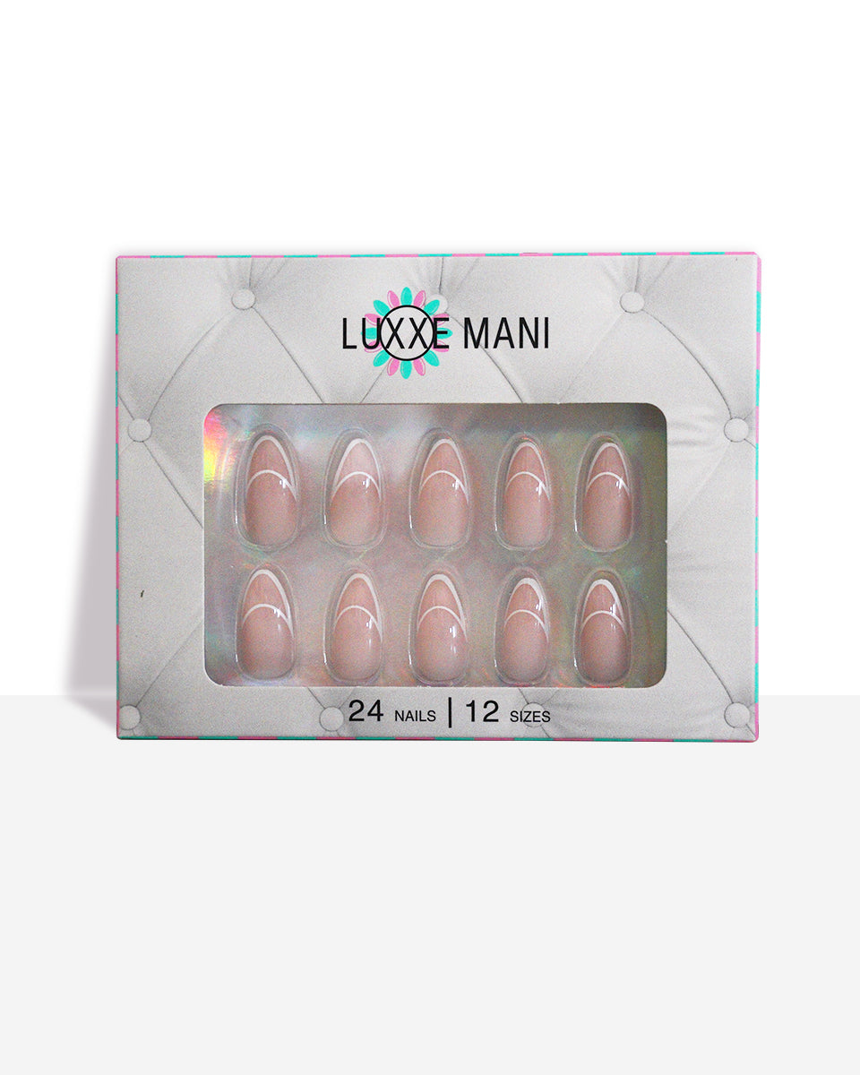 Elevate your elegance with the French Finesse Press-On Manicure Set. This luxurious set includes 24 nails in 12 versatile sizes, ensuring a perfect fit for every finger. Featuring a sophisticated Medium Almond shape, each nail showcases a pale pink/nude base adorned with a chic double French line, adding a modern twist to a timeless classic.