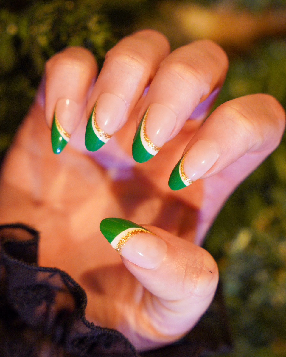 Elevate your elegance with the Mistletoe Magic Press-On Manicure Set. This luxurious set includes 24 nails in 12 versatile sizes, ensuring a perfect fit for every finger. Featuring a sophisticated Medium Almond shape, each nail showcases a beautiful pink base with a unique French tip adorned with white and gold glitter, adding a festive and glamorous twist to a timeless classic.