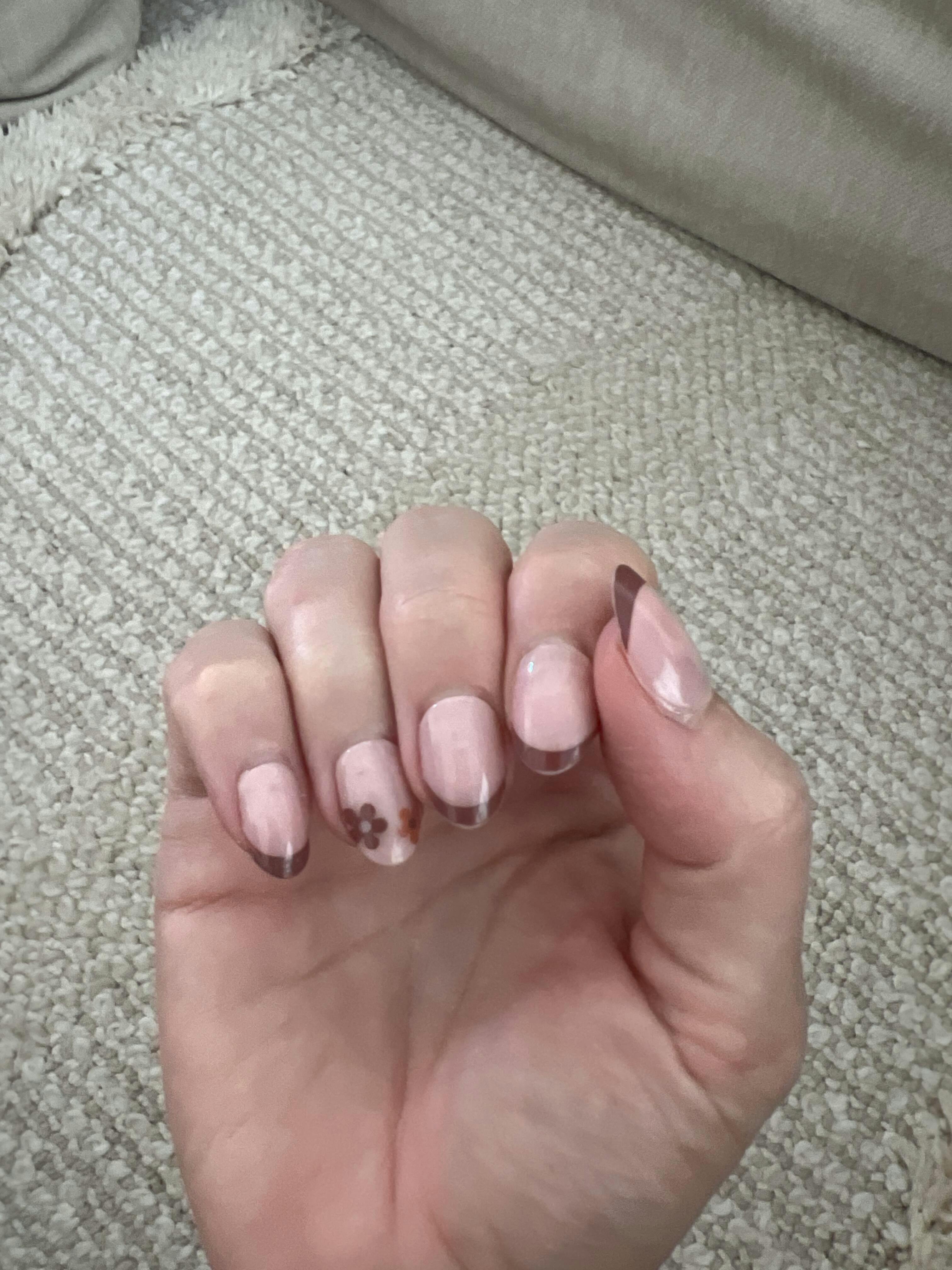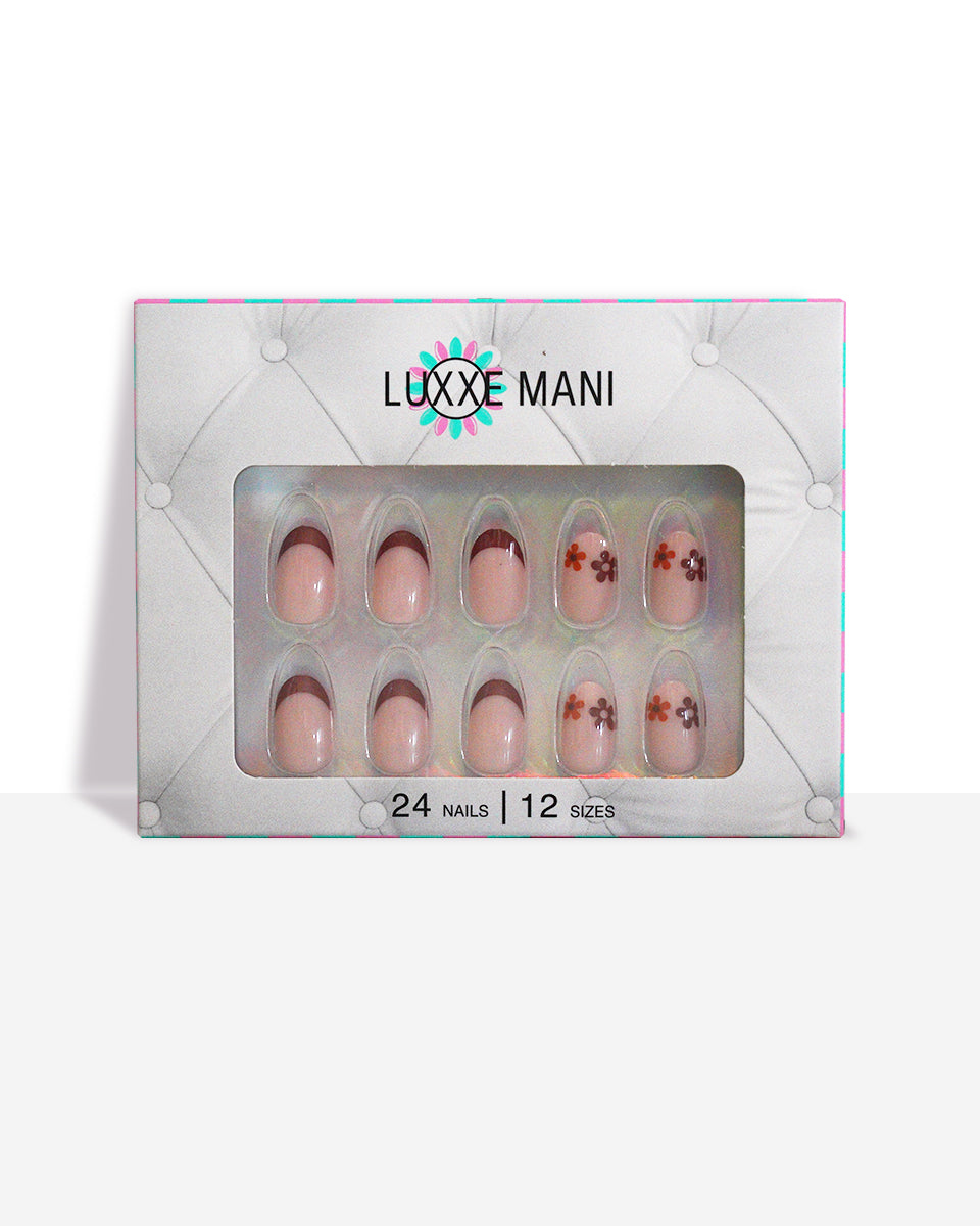 Embrace timeless beauty with the Natural Petals Press-On Manicure Set. This exquisite set includes 24 nails in 12 versatile sizes, ensuring a perfect fit for every finger. Featuring a chic Short Oval shape, each nail is adorned with warm brown/nude French tips and delicate floral accents, offering a harmonious blend of elegance and natural charm.