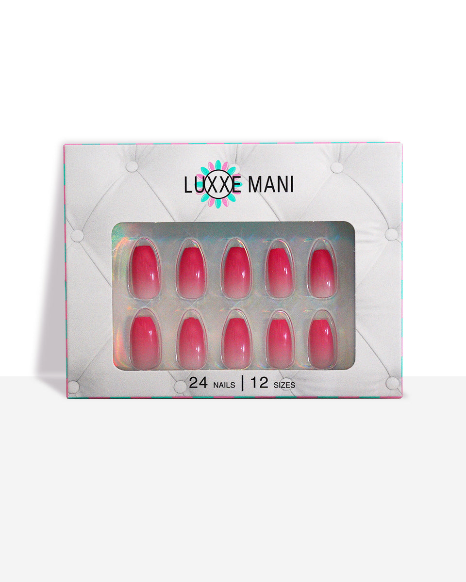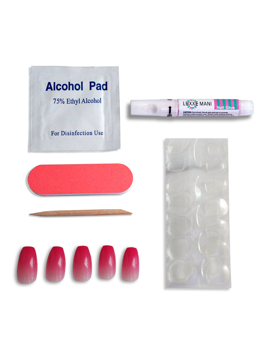 Illuminate your fingertips with the captivating beauty of the Rose Radiance Press-On Manicure Set. This enchanting collection features 24 nails in 12 versatile sizes, ensuring a perfect fit for every finger. Crafted in a chic Medium Coffin shape, each nail boasts a mesmerizing ombre transition from delicate rose pink to vibrant hot pink, exuding the radiant charm of blooming roses in full summer bloom.