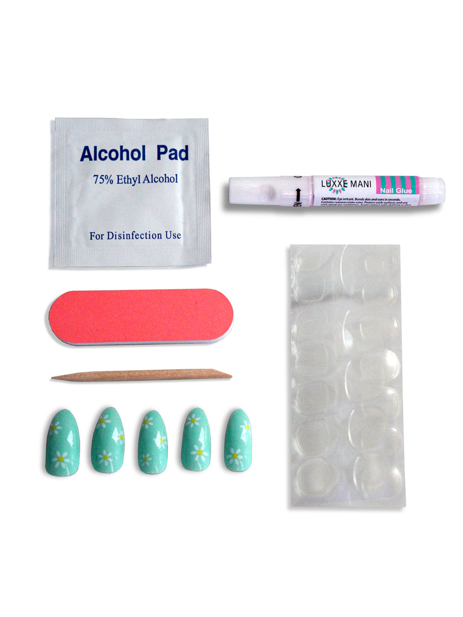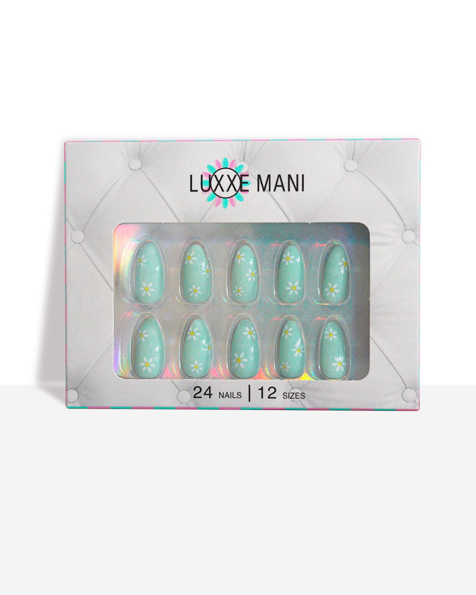 Illuminate your fingertips with the radiant charm of the Sunny Petal Press-On Manicure Set. This captivating collection features 24 nails in 12 versatile sizes, ensuring a perfect fit for every finger. Crafted in a chic Medium Almond shape, each nail boasts a mesmerizing light teal/mint hue reminiscent of a sunny summer day, adorned with adorable floral accents that exude playful elegance.