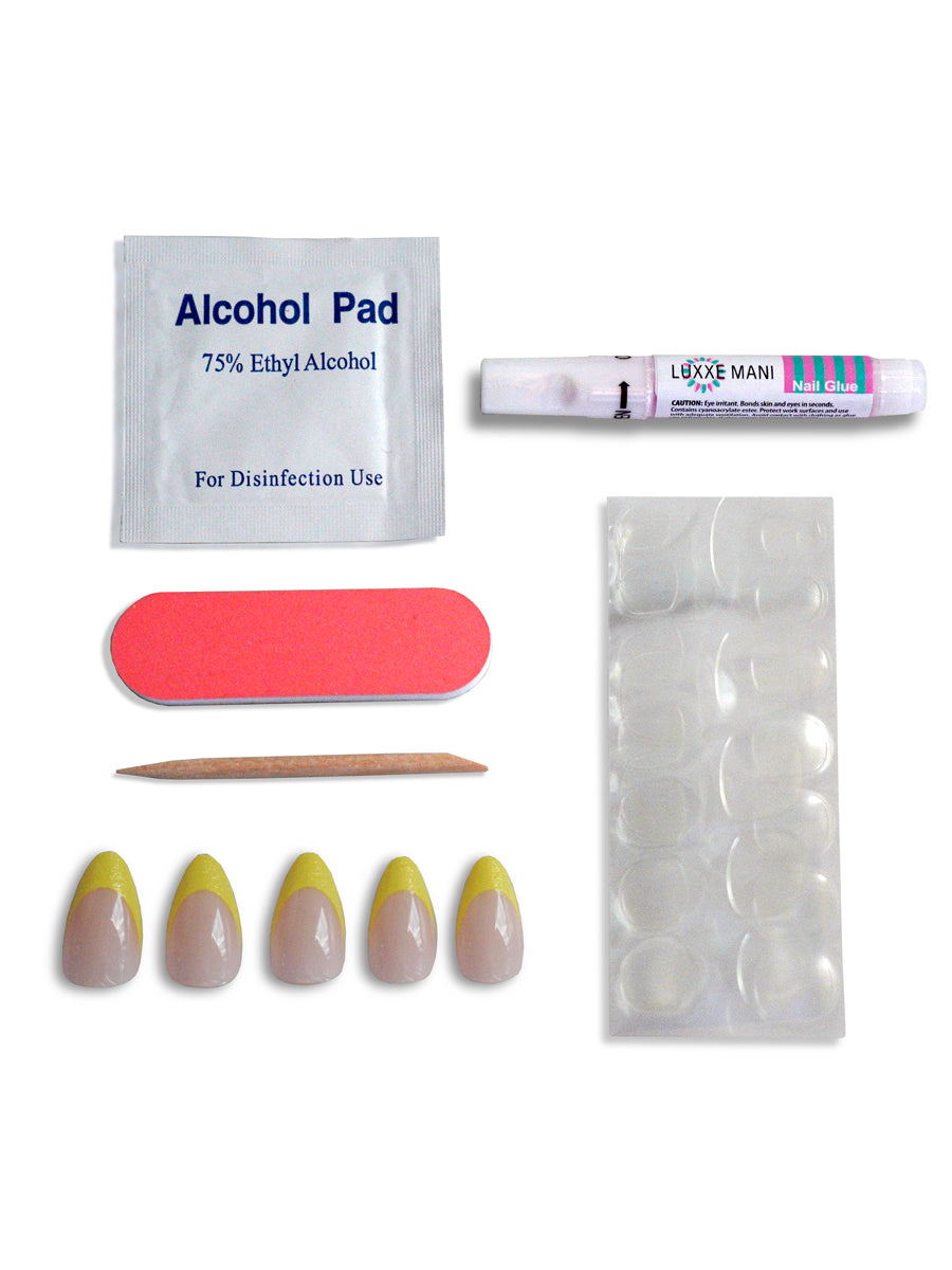 Ignite your nails with the vibrance of summer using the Sunny Spark Press-On Manicure Set. This dynamic collection features 24 nails in 12 versatile sizes, ensuring a perfect fit for every finger. Crafted in a chic Short Almond shape, each nail showcases a neon yellow French tip that exudes energy and style.