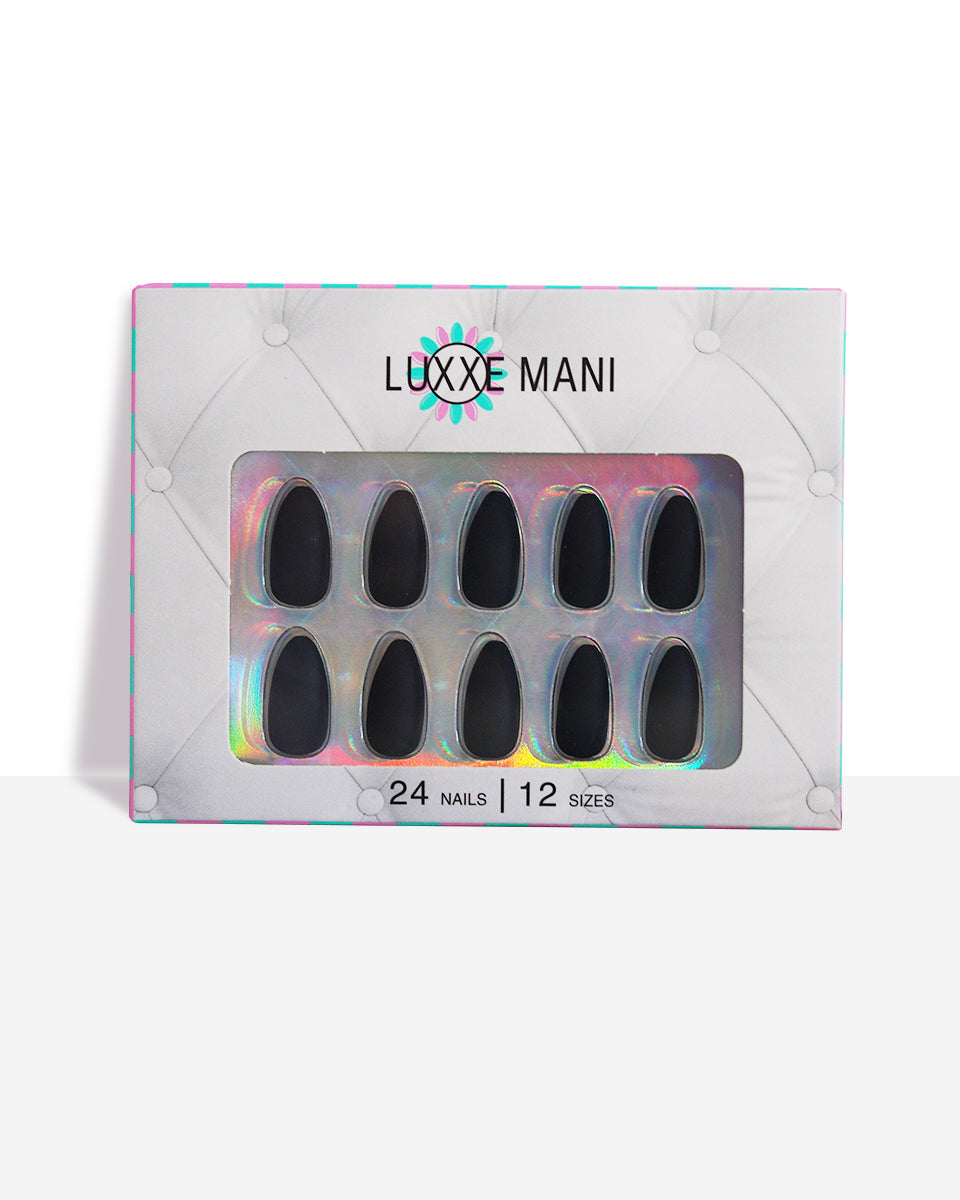 Embrace refined elegance with the Velvet Night Press-On Manicure Set. This exquisite collection features 24 nails in 12 versatile sizes, ensuring a perfect fit for every finger. Crafted in a chic Medium Almond shape, each nail showcases a matte black velvet-like finish that exudes timeless sophistication and mystery.